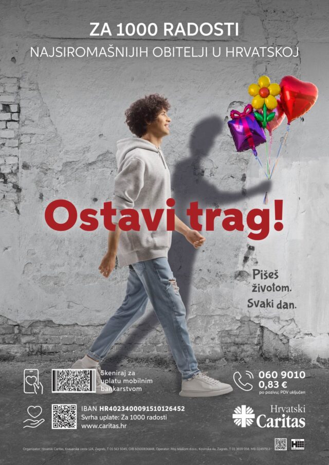 I ove godine priključili smo se nacionalnom humanitarnom programu Hrvatskog Caritasa ˝Za 1000 radosti – Ostavi trag˝, kojim se nastoji prikupiti pomoć za najsiromašnije obitelji u Hrvatskoj. Za naše učenike Caritas je poslao prigodne grafitne olovke s gumicom. Na svakoj od olovaka piše jedna od inačica ovogodišnjeg slogana „Ostavi trag!“ – u obliku: „Ostavi originalan, vedar, plemenit, kreativan ili pozitivan trag!“. Učenici su svojim dobrovoljnim prilozima u iznosu od 1 eura prikupili 247 eura, koji su uplaćeni na račun Hrvatskog Caritasa.
