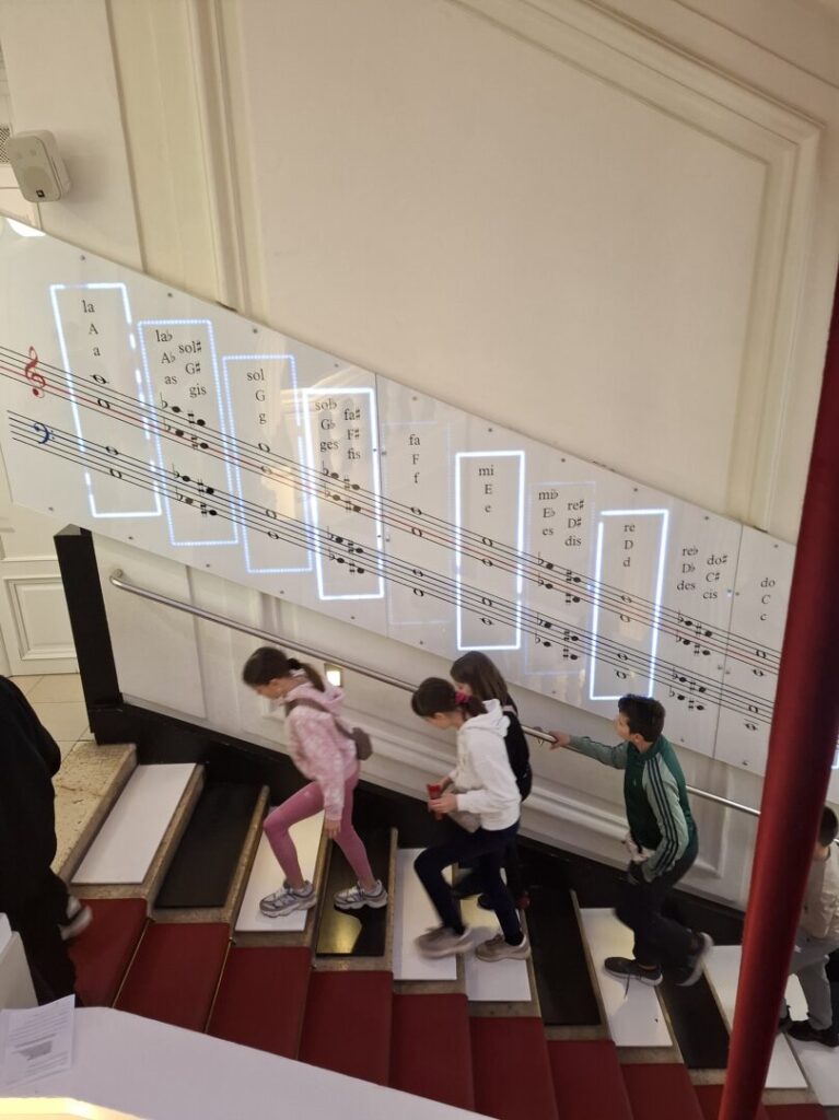 Na glazbenim stepenicama učenici su hodanjem odsvirali poznatu Mozartovu melodiju „Twinkle Twinkle Little Star“, čime su na zabavan način povezali pokret i glazbu.